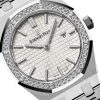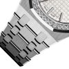 Unworn Audemars Piguet Royal Oak QUARTZ 67651ST.ZZ.1261ST.01, 33 mm, Silver-toned dial with “Grande Tapisserie” pattern, white gold applied hour-markers and Royal Oak hands with luminescent coating, Stainless steel case, 40 brilliant-cut diamonds, ~0.71 carats bezel, Quartz movement, 7 Jewels, Stainless steel bracelet with AP folding clasp. Water resistant to 50 m.