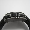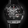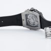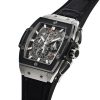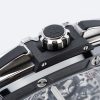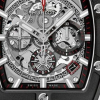 Hublot Spirit of Big Bang Titanium 45mm watch. Brushed/satin finished titanium case with polished beveled corners, Reference 601.NX.0173.LR. This model has Sapphire crystal transparent dial with bold brushed finished Stainless Steel minute and hour hands with luminous filled top and skeletonized bottoms. Applied brushed Stainless Steel ‘Applique’ index hour markers with luminous fill. Black inner bezel flange at the dial perimeter with a red minute/seconds track. Small running seconds sub-dial hand located at the 9 o’clock position. Visible skeletonized date wheel. Current date displayed between the 4 and 5 o’clock position, highlighted by a black background and a blue border. Chronograph Stopwatch function: large central seconds counter with the “H” logo as a counter-weight; black-rimmed 30-minute sub-dial counter located at the 3 o’clock position; black-rimmed 12-hour sub-dial counter located at the 6 o’clock position. Brushed and polished titanium crown and chrono buttons with black insert. The crown has Pull / Press function, the Hublot logo engraved on it. The dial closed by a Scratch-resistant Sapphire Crystal with Anti-reflective Treatment. Of Sapphire Crystal made transparent case back. The watch is equipped fixed titanium bezel with Microblasted (dark shade of finishing) recessed zones, secured with 6 polished “H” style Titanium screws. Lateral case center band and bezel lugs of black composite resin. The watch is self-winding Skeleton Chronograph Movement Hublot Caliber HUB 4700, contains 31 Jewels and has an approximate power reserve of 50 hours. This model presented on a Black “Gummy-Alligator” strap: Alligator on the top-side and rubber on the underside and edges with Titanium Deployant Buckle Clasp. The water resistance is up to 100m/330ft (10 ATM).
