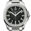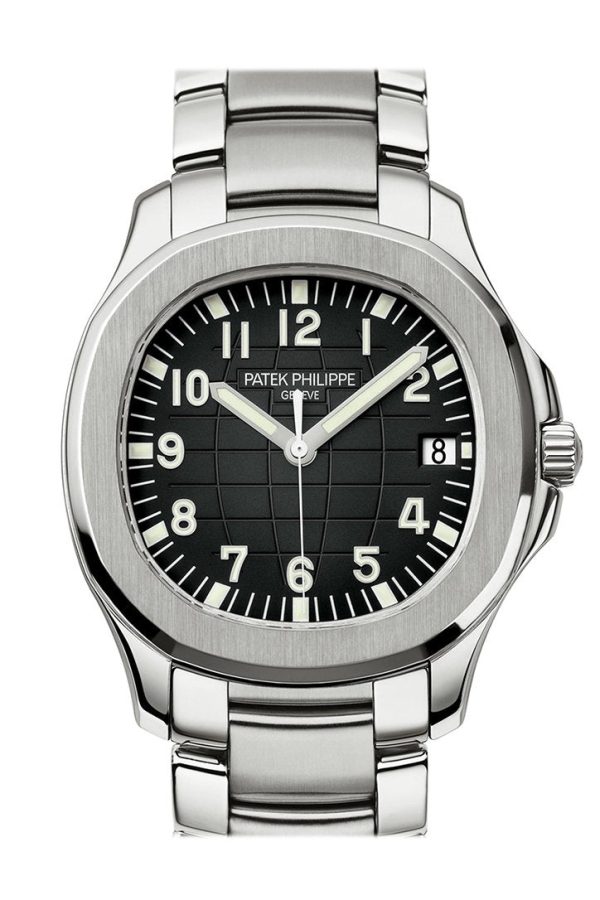 Silver-tone stainless steel case with a silver-tone stainless steel bracelet. Fixed silver-tone stainless steel bezel. Black dial with luminous hands and Arabic hour markers. Minute markers around the outer rim. Dial Type: Analog. Luminescent hands and markers. Date display at the 3 o’clock position. Patek Philippe Calibre 324 S C Automatic movement, containing 29 Jewels, composed of 213 parts, bitting at 28800 vph, and has a power reserve of approximately 45 hours. Scratch resistant sapphire crystal. Screw down crown. Transparent see through case back. Oval case shape, case size: 40 mm x 40 mm. Fold over with push button release clasp. Water resistant at 120 meters / 400 feet. Functions: date, hour, minute, second. Aquanaut Series. Luxury watch style. Watch label: Swiss Made. Patek Philippe Aquanaut Black Dial Stainless Steel Automatic Mens Watch 5167-1A Patek Philippe Aquanaut Automatic Black Dial Steel Men’s Watch 5167/1A-001 5167-1A-001 5167