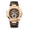 Patek Philippe Nautilus Watches. 40.5mm 18K rose gold case, sapphire crystal back, screw-down crown, black-brown dial with gold applied hour markers with luminescent coating, self winding caliber CH 28-520 C movement with 60-minute and 12-hour monocounter chronograph and date, approximately 55 hour of power reserve, matt dark brown alligator strap with Nautilus fold-over buckle. Water resistant to 120 meters.