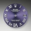 • Dial color: Aubergine dial with a fine sunrays, applied polished 18k White Gold Roman numerals as hour markers and 11 diamonds on large numeral VI