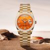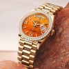 Unworn watch Rolex Day-Date 36, 18k Yellow Gold, 36mm, Ref# 128348rbr-0049. New for 2023 in the Oyster Perpetual Day-Date 36, series are watches with dials made of decorative stones. Thanks to the unique crystallized effects, matrices and veins of aventurine, carnelian and turquoise, and their skillful processing, each dial turns into a unique work of art, being a worthy addition to the rest of the flawless Day-Date details. As always elegant and luxurious Day-Date 36 – is an excellent choice for people who appreciate unique beauty, high style and absolute comfort. The dial is carved from Carnelian, an orange-colored stone characterized by lines of various shapes and sizes, forming an intricate cameo of patterns. Its index hour markers and Roman numerals VI and IX in 18k Yellow Gold are respectively set with 32 and 24 diamonds, using a flawless setting and leveling technique that highlights the stones’ subtle brilliance. The classic polished hands made of 18k Yellow Gold look amazing on such a dial, emphasizing the sophistication of the model. The date indicator is traditionally placed at the 3 o’clock position. At the 12 o’clock, position is a semi-circular window showing the day of the week in full, providing an instantly recognizable, unique design of Day-Date. The ribbed screw-down crown in 18k Yellow Gold Triplock with double watertight system, adorned with the Rolex logo, is a traditionally recognizable part of Rolex watches. The dial is covered with a scratch-resistant anti-reflective sapphire crystal and a Cyclops lens above the date with double anti-reflective coating. A solid 18k Yellow Gold screw-down case back with fine fluted edges, closes the movement. Fixed 18k Yellow Gold bezel set with 52 brilliant-cut diamonds – sparkling a symphony that will adorn the watch and enchant its owner. The in-house Rolex mechanical movement, caliber 3255, contains 31 jewels and has an approximate power reserve of approximately 70 hours powers. This delightful timepiece is presented on an 18k Yellow Gold President bracelet with semi-circular 3-piece links for flawless beauty. It features Rolex’s original concealed folding Crownclasp to secure the watch on your wrist. Water resistant up to 100m/330ft (10 ATM). Make: Rolex Model: Day-Date 36 Reference: 128348rbr-0049 Diameter: 36mm Case material: 18k Yellow Gold and Diamonds Dial color: Carnelian, an orange-colored Bezel Type: Fixed Bezel Color: Yellow Bezel Material: 18k Yellow Gold and Diamonds Crystal: Scratch-resistant sapphire, Cyclops lens over the date Movement: Perpetual, mechanical, self-winding Bracelet Type: President, semi-circular three-piece links Bracelet Material: 18k Yellow Gold Clasp: Concealed folding Crownclasp Functions: Centre hour, minute and seconds hands. Instantaneous day and date in apertures, unrestricted rapid setting. Stop-seconds for precise time setting Water resistance: Up to a 100m/330ft (10 ATM) Warranty: Balance of Rolex International Warranty The watch is unworn and comes complete with full set of original accessories, such as watch box, warranty card dated recently, booklets and manuals.