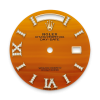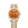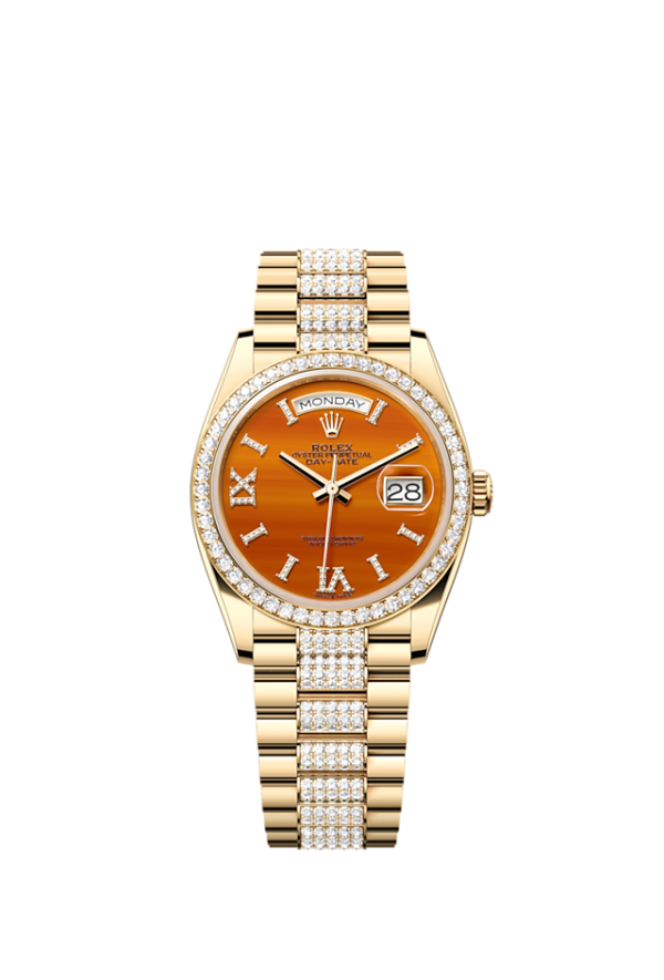 Unworn watch Rolex Day-Date 36, 18k Yellow Gold, 36mm, Ref# 128348rbr-0050. New for 2023 in the Oyster Perpetual Day-Date 36, series are watches with dials made of decorative stones. Thanks to the unique crystallized effects, matrices and veins of aventurine, carnelian and turquoise, and their skillful processing, each dial turns into a unique work of art, being a worthy addition to the rest of the flawless Day-Date details. As always elegant and luxurious Day-Date 36 – is an excellent choice for people who appreciate unique beauty, high style and absolute comfort. The dial is carved from Carnelian, an orange-colored stone characterized by lines of various shapes and sizes, forming an intricate cameo of patterns. Its index hour markers and Roman numerals VI and IX in 18k Yellow Gold are respectively set with 32 and 24 diamonds, using a flawless setting and leveling technique that highlights the stones’ subtle brilliance. The classic polished hands made of 18k Yellow Gold look amazing on such a dial, emphasizing the sophistication of the model. The date indicator is traditionally placed at the 3 o’clock position. At the 12 o’clock, position is a semi-circular window showing the day of the week in full, providing an instantly recognizable, unique design of Day-Date. The ribbed screw-down crown in 18k Yellow Gold Triplock with double watertight system, adorned with the Rolex logo, is a traditionally recognizable part of Rolex watches. The dial is covered with a scratch-resistant anti-reflective sapphire crystal and a Cyclops lens above the date with double anti-reflective coating. A solid 18k Yellow Gold screw-down case back with fine fluted edges, closes the movement. Fixed 18k Yellow Gold bezel set with 52 brilliant-cut diamonds – sparkling a symphony that will adorn the watch and enchant its owner. The in-house Rolex mechanical movement, caliber 3255, contains 31 jewels and has an approximate power reserve of approximately 70 hours powers. This delightful timepiece is presented on an 18k Yellow Gold Diamond-set President bracelet with semi-circular 3-piece links for flawless beauty. It features Rolex’s original concealed folding Crownclasp to secure the watch on your wrist. Water resistant up to 100m/330ft (10 ATM).