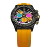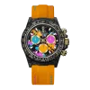 A unique multi-colored dial with bright chronograph counters. The stitch in the orange strap matches the colors in the dial.