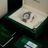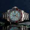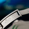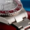This model features a meteorite dial and a two-colour Cerachrom bezel insert in red and blue ceramic. In addition to conventional hour, minute and seconds hands, the GMT-Master II features an arrow-tipped hand, which circles the dial once every 24 hours, as well as a bidirectional rotatable 24-hour graduated bezel. The distinctively coloured 24-hour hand displays the “home” reference time in a first time zone which can be read on the graduations on the bezel. The traveller’s local time is easily set by “jumping” from hour to hour, thanks to an ingenious mechanism operated via the winding crown: the hour hand can be adjusted forwards or backwards independently of the minute and seconds hands. This allows travellers to adapt to their new time zone without affecting the precision of their timekeeping.