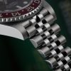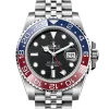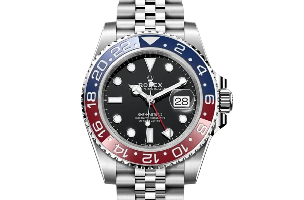 This model features a black dial and a two-colour Cerachrom bezel insert in red and blue ceramic. In addition to conventional hour, minute and seconds hands, the GMT-Master II features an arrow-tipped hand, which circles the dial once every 24 hours, as well as a bidirectional rotatable 24-hour graduated bezel. The distinctively coloured 24-hour hand displays the “home” reference time in a first time zone which can be read on the graduations on the bezel. The traveller’s local time is easily set by “jumping” from hour to hour, thanks to an ingenious mechanism operated via the winding crown: the hour hand can be adjusted forwards or backwards independently of the minute and seconds hands. This allows travellers to adapt to their new time zone without affecting the precision of their timekeeping.