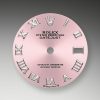 • Dial color: Pink dial with a fine sunrays and a applied polished 18k White Gold Roman numerals as hour markers
