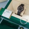 The Yacht-Master’s new Oysterflex bracelet, developed and patented by Rolex, offers a sporty alternative to metal bracelets. The bracelet attaches to the watch case and the Oysterlock safety clasp by a flexible titanium and nickel alloy metal blade. The blade is overmoulded with high-performance black elastomer which is particularly resistant to environmental effects, very durable and perfectly inert for the wearer of the watch. For enhanced comfort, the inside of the Oysterflex bracelet is equipped with a patented longitudinal cushion system that stabilizes the watch on the wrist and fitted with an 18 ct Everose gold Oysterlock safety clasp. It also features the Rolex Glidelock extension system, designed and patented by the brand. This inventive toothed mechanism, integrated beneath the clasp, allows fine adjustment of the bracelet length by some 15 mm in increments of approximately 2.5 mm, without the use of tools.